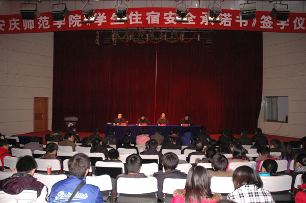 12月16日下午,保卫处、学生处、团委在龙山校区图书馆东报告厅共同举办了《学生住宿安全承诺书》签订仪式。党委委员、副院长时新中、闵永新出席仪式;保卫处、学生处、后勤管理处、团委、后勤集团、安苑公司负责人、各院系分管学生工作负责人参加签订仪式;参加仪式的还有校学生住宿管理委员会全体成员、学生公寓管理委员会全体成员、各院系学生会保卫部部长和各班级安保委员。仪式由保卫处处长高家久主持。