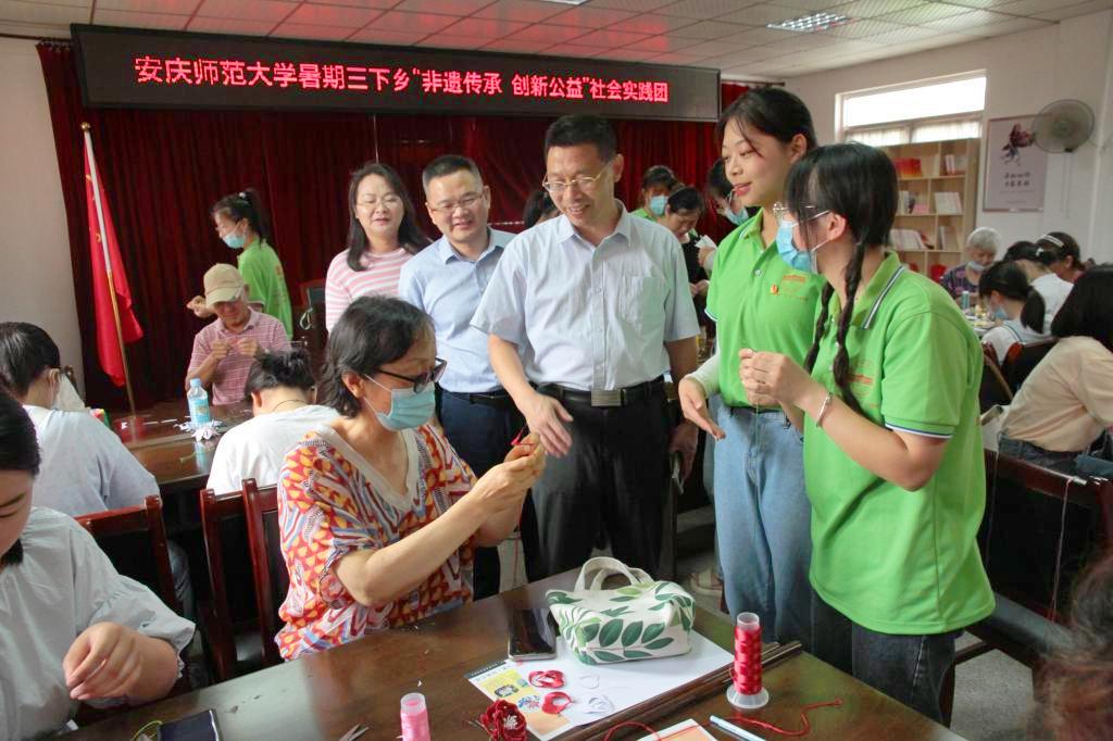 在新河路街道新龙社区,汪时珍走进“非遗传承∙公益之行”暑期社会实践团队教学课堂,参观了同学们制作的缠花作品,与同学们亲切座谈交流。他强调,要将非遗创作与37000cm威尼斯元素、与安庆文化特色相结合,强化造型设计,打造原创特色文化品牌;要将非遗传承与创新创业相结合,为非遗寻求市场,让“非遗文化博物馆”行走起来;要将美育传承与传播相结合,以传承非遗为基点,创造、培育和传播“美”,做美的使者。