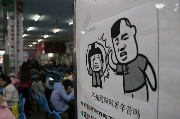 在食堂打菜的窗口旁、在饭桌边的柱子上、在教学楼的墙面上、在垃圾桶的正上方……随处可见表情包。“教学楼的清洁工阿姨看到我们去贴表情包,呼吁大家不要带早餐进教学楼、文明扔垃圾,笑得很开心,希望我们的标语能够起到作用,让清洁工阿姨也轻松一点。”储子婧说。