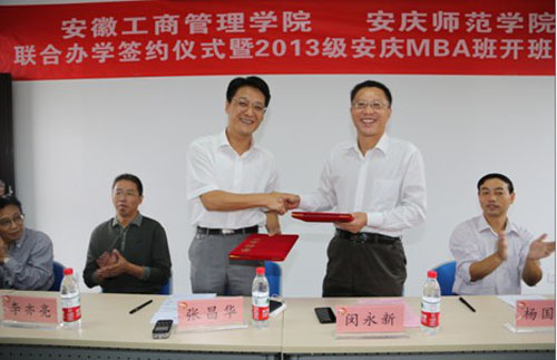 安庆师范学院副院长闵永新和安徽工商管理学院专职副院长张昌华分别代表双方签字并互换文件。闵永新副院长介绍了安庆师范学院的发展历史和现状,并就安庆MBA班的教学提出了具体要求和意见。张昌华副院长发表了热情洋溢的讲话,他介绍了安徽工商管理学院的基本情况及MBA项目的发展概况,并对2013级安庆MBA班全体学员提出了几点殷切希望。