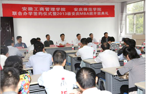 9月7日上午,安庆师范学院与安徽工商管理学院联合办学签约仪式暨2013级安庆MBA班开班典礼在菱湖校区MBA专用教室隆重举行。安庆师范学院副院长闵永新、安徽工商管理学院专职副院长张昌华出席开班典礼,经济与管理学院、继续教育学院负责同志,相关授课教师代表、全体2013级安庆MBA班学员及往届优秀学员代表共50余人参加了典礼。安徽工商管理学院教学管理部朱春林部长主持开班典礼。