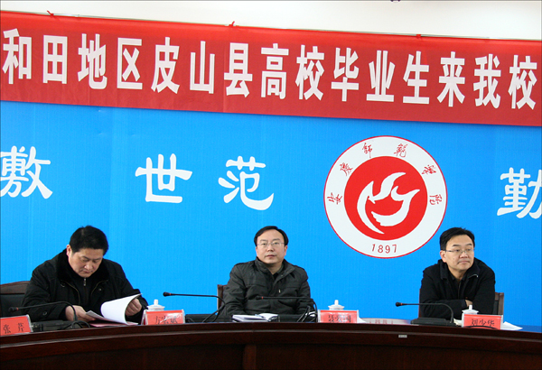 2月8日上午,中共合肥市委常委、安徽省援疆干部领队、安徽省援疆指挥部指挥长、新疆和田地委副书记聂爱国,安徽省人力资源和社会保障厅党组成员、副厅长刘少华等领导莅临威尼斯官网,检查指导威尼斯官网承办的“新疆和田地区皮山县未就业毕业生培养”工作的筹备情况。