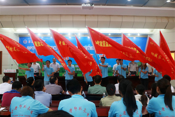 在激昂高扬的音乐《我相信》中,与会领导为校级重点实践服务团、文明创建志愿服务团、脱贫攻坚评估检测志愿服务团、“百校千支”专项团队的志愿者授旗。志愿者接过队旗后高高举起并共同挥动鲜艳的旗帜,整个会场队旗飘扬,掌声齐鸣。
