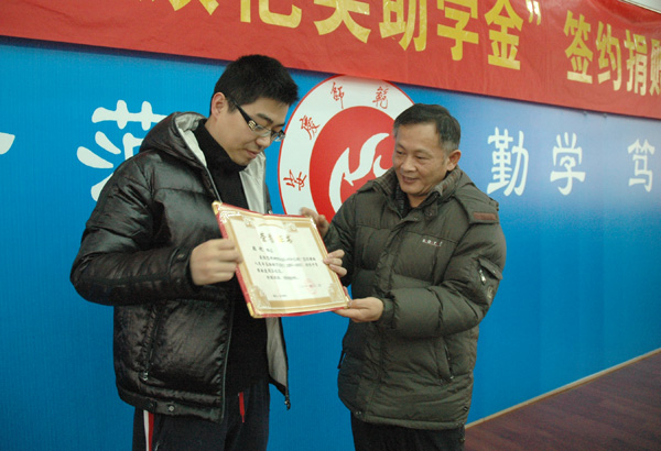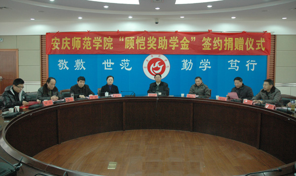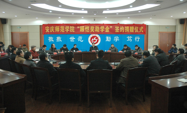 2011年12月31日下午,“顾 恺奖助学金”捐赠签字仪式在威尼斯官网龙山校区行政楼二楼圆桌会议室隆重举行。校党委书记、安庆师范学院校友会顾问何小祥,校党委副书记、院长、安庆师范学院校友会会长朱士群,党委副书记、纪委书记殷红,党委委员、副院长闵永新,党委委员、副院长张群,党委委员、副院长汪时珍,校督导员、安庆师范学院友会常务副会长时新中,党委委员、组织部长陈光明,广东瑞驰佰富投资有限公司董事长顾 恺校友出席了仪式。校友会校内理事、各学院学生代表共50余人参加了仪式。捐赠签字仪式由学生处副处长、校友会副秘书长金文斌主持。