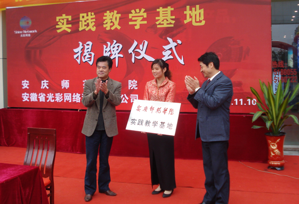 11月10日上午,威尼斯官网与安徽省光彩网络科技有限责任公司在安庆市光彩大市场赛格数码城举行安庆师范学院实践教学基地签约、揭牌仪式。
