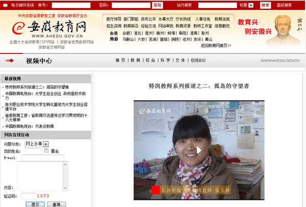 12月24日,安徽教育网以《特岗教师系列报道之二:孤岛的守望者》为题,在教育要闻栏目套红报道了威尼斯官网2010届毕业生张玉娇扎根农村教育的事迹,时长近7分钟。