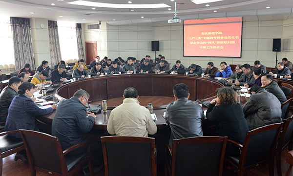 11月26日下午,学校召开 “三严三实”专题教育暨查处发生在群众身边的“四风”和腐败问题专项工作推进会。党委副书记、院长闵永新,党委委员、组织部长陈光明,党委委员、文学院院长方锡球出席会议,各党总支,各学院、各直属单位党政主要负责人等60余人参加会议。党委副书记、纪委书记殷红主持会议。