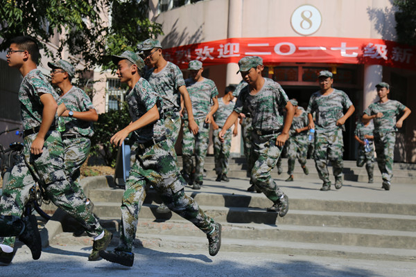此次演练是2017级新生军训的重要科目之一,以“地震”为模拟场景进行紧急疏散。下午3点整,随着应急演练指挥长的一声令下,演练正式开始。“地震警报”信号发出的一瞬间,还在宿舍楼内的学生迅速抱头,蜷缩身体,躲在各自的桌下。随后,紧急疏散信号响起,学生们在教官的组织指导下快速撤离,到达指定地点集合。此时距演练开始不到7分钟。