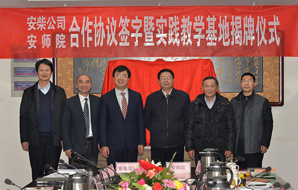 党委书记何小祥与安庆中船柴油机有限公司书记胡春共同为实践教学基地揭牌,副院长汪时珍代表学校与安庆中船柴油机有限公司在合作协议书上签字。