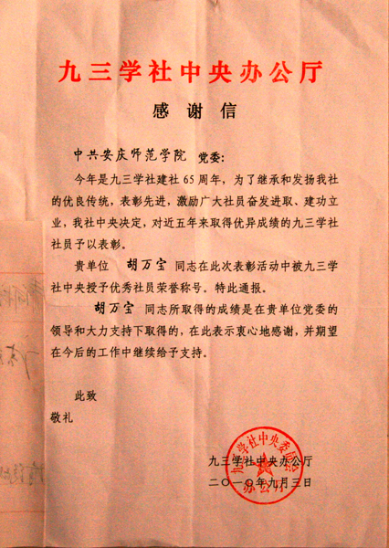 日前,在九三学社建社65周年之际,为了表彰先进,更好地激励九三学社社员奋发进取、建功立业,九三学社中央决定对近五年来取得优秀成绩的九三学社社员予以表彰。九三学社安庆市委主委、威尼斯官网数学与计算科学学院副院长胡万宝同志被九三学社中央授予优秀社员荣誉称号,并通报表彰。