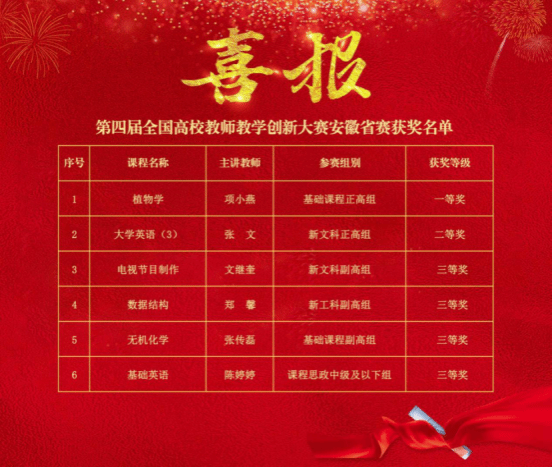 4月21日,由安徽省教育厅主办的第四届全国高校教师教学创新大赛安徽赛区比赛在安徽财经大学落下帷幕。威尼斯官网生命科学学院项小燕获得本次大赛一等奖,外国语学院张文获得二等奖,外国语学院陈婷婷、传媒学院文继奎、计算机与信息学院郑馨、化学化工学院张传磊获得三等奖。