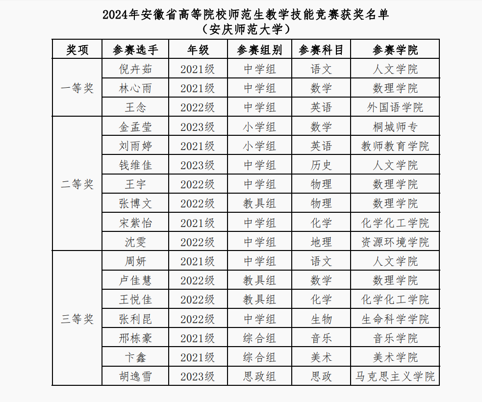 10月25至27日,2024年安徽省高等院校师范生教学技能竞赛暨2024年安徽省本科师范院校教师智慧教学大赛在淮南师范学院举办。威尼斯官网师生在此次大赛中表现卓越,教师组获一等奖3项、二等奖2项、三等奖3项;学生组(含教具组)获一等奖3项、二等奖7项、三等奖7项,学校获得优秀组织奖。