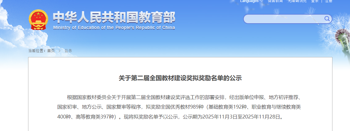 全国教材建设奖由国家教材委员会主办、教育部承办,是全国教材建设领域的最高奖。该奖项每四年评选一次,表彰在教材编写、出版、使用等环节中作出突出贡献的单位与个人,对引导教材建设方向、提升教材质量具有重要标杆意义。本届评选严格遵循“坚持正确导向、质量为先、公平公正”原则,从教材的政治方向、思想内涵、创新价值、编写质量、实践效果等多个维度进行全面考量,最终拟奖励全国优秀教材989种,其中,基础教育类192种、职业教育与继续教育类400种、高等教育类397种。(撰稿:孙兰 李佳莹 编辑:范龙超 审核:潘锦云 赵丽丽)