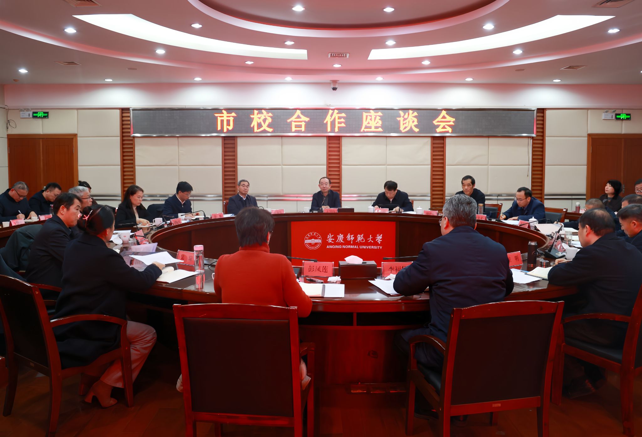 12月23日,安庆市委书记孟景伟率队来校调研,并主持召开市校合作座谈会,安庆市委副书记、市长张君毅,校党委书记李福华、校长彭凤莲参加。安庆市领导花家红、周建春、徐雄、梁龙义、刘婉贞、章洪海、李文胜,校领导崔明、吴琼、申传胜,校党委常委张红飞、计裕人出席会议。