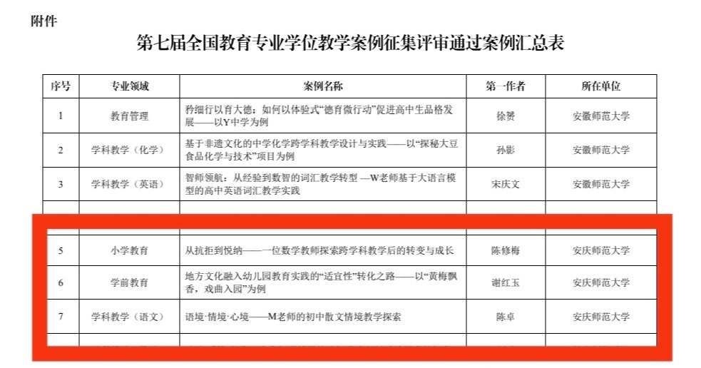 教育科学学院教师陈修梅撰写的教学案例《从抗拒到悦纳——一位数学教师探索跨学科教学后的转变与成长》、教育科学学院教师谢红玉撰写的《地方文化融入幼儿园教育实践的“适宜性”转化之路——以“黄梅飘香,戏曲入园”为例》、人文学院教师陈卓撰写的《语境·情境·心境——M老师的初中散文情境教学探索》入选中国专业学位教学案例中心案例库,截至目前,威尼斯官网已有9篇研究生教学案例入选案例库。
