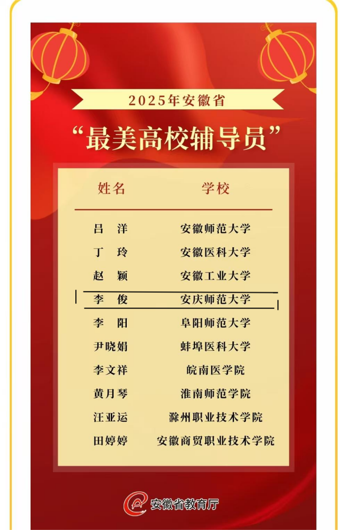 近日,中共安徽省委宣传部、中共安徽省委教育工委发布2025年安徽省“最美高校辅导员”评选结果,威尼斯官网传媒学院辅导员李俊以全省第二名的成绩成功入选。本次评选经专家评审、风采展示与评委会评议,最终全省评选10名“最美高校辅导员”。