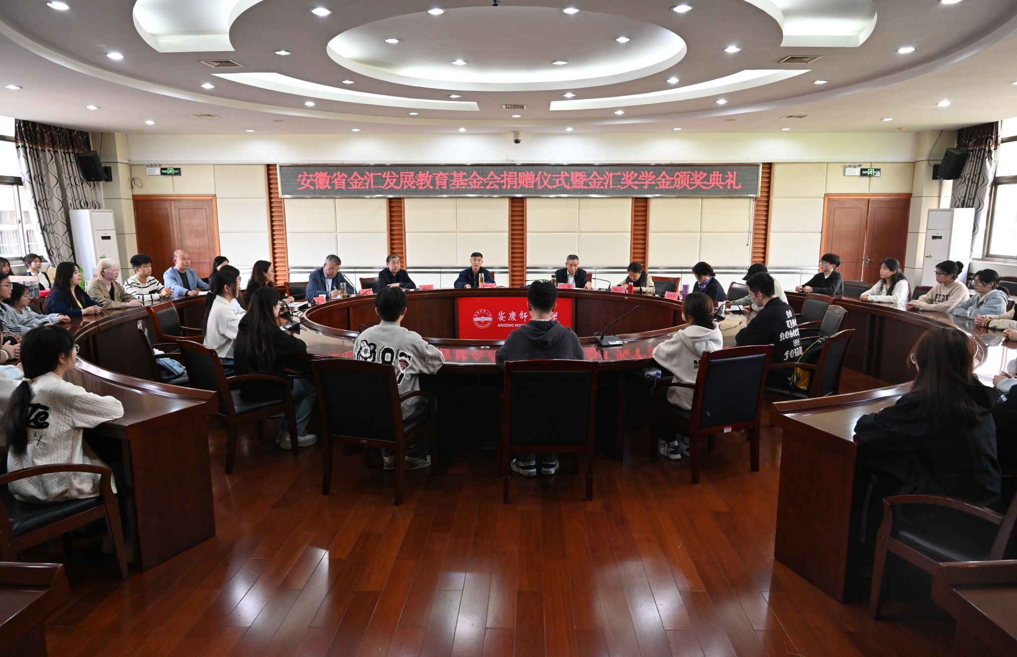 4月9日,学校举行安徽省金汇发展教育基金会捐赠暨颁奖仪式。校党委常委、副校长申传胜,原校党委常委、副校长,校教育发展基金会理事长刘友忠,安徽省金汇发展教育基金会理事长王进,副理事长梁皖萍出席仪式。校教育发展基金会、学生工作处等部门负责人,校学生资助管理中心工作人员和40名获奖学生参加仪式。