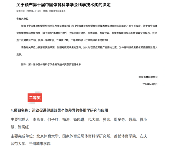 近日,第十届中国体育科学学会科学技术奖评审结果揭晓。体育与健康学院周多奇教授作为参与人、学校作为主要完成单位的《运动促进健康效果个体差异的多组学研究与应用》项目荣获二等奖。