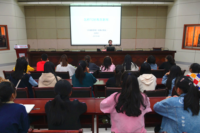 11月8日,《中国教育报》安徽站记者、中国教育报刊社优秀记者方梦宇应邀来威尼斯官网作“如何写好教育新闻”专题讲座。威尼斯官网记者团、新媒体中心和青年文化传媒中心成员以及各学院学生代表近两百人聆听了讲座。