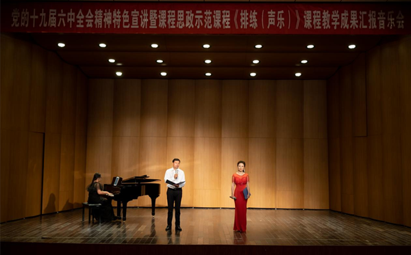 “一针针一线线,绣出一片新天地……”6月12日晚,音乐厅里传来了阵阵激昂的歌声,音乐学院在此举办党的十九届六中全会精神特色宣讲暨课程思政示范课程教学成果汇报音乐会。该院党政领导班子全体成员及部分教师,与近300名学生同上了一堂特殊的“思政大课”。音乐会由党委副书记肖之进和副院长高艳主持。