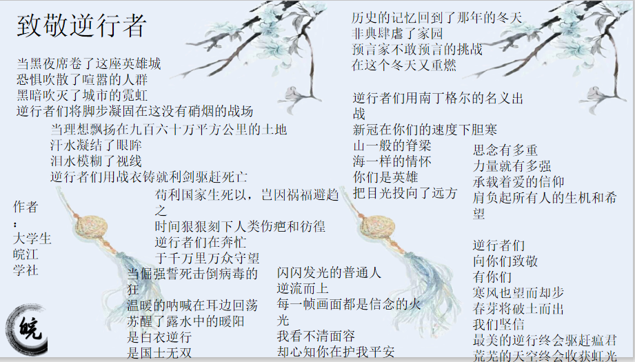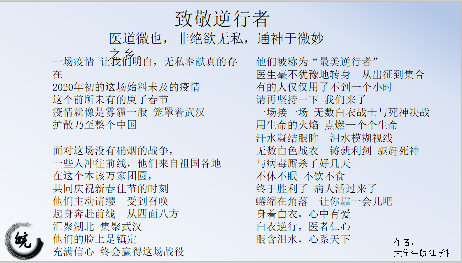 “医道微也,非绝欲无私,通神于微妙之乡……”“逆行者们用南丁格尔的名义出战,新冠在你们的速度下胆寒……”为了致敬抗击疫情的工作人员们,威尼斯官网大学生皖江学社的成员共创作了千余字的诗词作品。2月9日,该社团在官方媒体平台上发布了由协会成员原创的诗词、手绘作品、电子海报等。