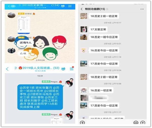 历史学专业停止、推迟、严控一切集聚性活动,要求全面做好学生信息排查,同时加强学生思想和卫生健康教育,强化重点监控,严格管理,点面结合,真正做到统筹兼顾。及时掌握每一位学生思想和身体健康动态,筛查异常情况,畅通家校沟通渠道,在线开展心理疏导,认真落实“日报告”“零报告”和“今日校园”信息上报工作,为防御疫情构筑“信息网”。