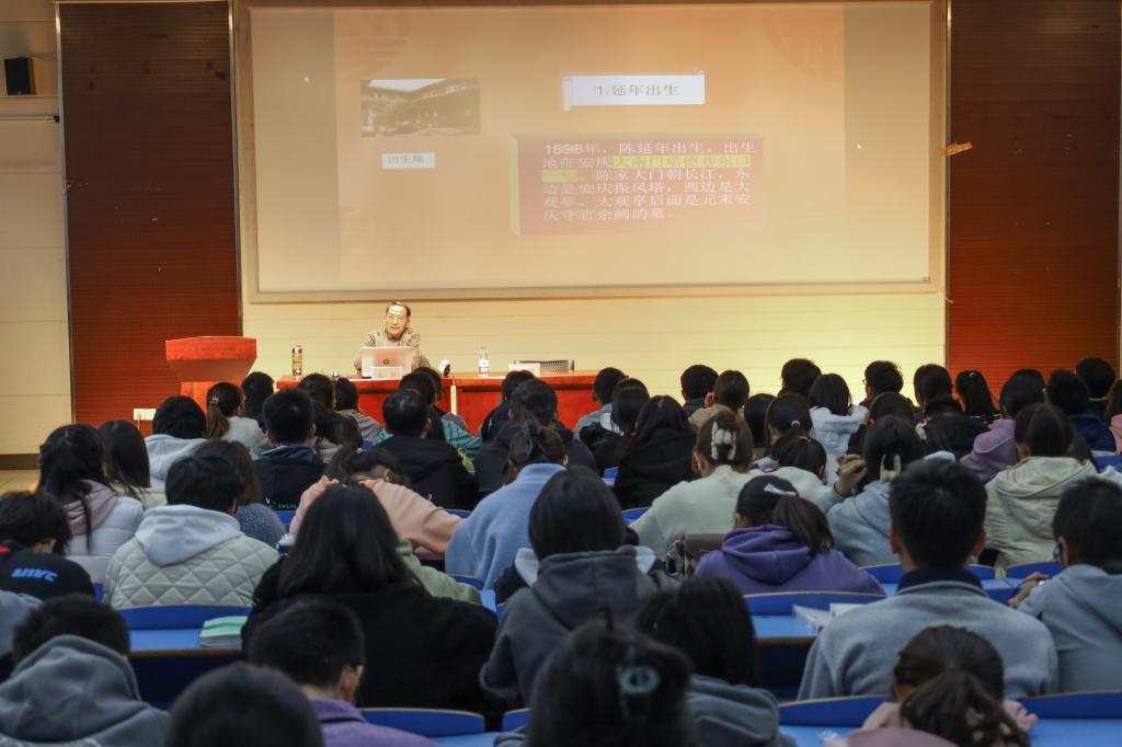 朱洪以《陈延年的品格、智慧与人生追求》为题,按照时间线索,从“少年读书”“自闯人生”“转向马克思主义”“莫斯科东方大学”“大革命洪流”“风口浪尖”“临危受命”“壮烈牺牲”等8个部分展开叙述,回顾了陈延年短暂而光荣的一生。专业角度分析人物性格、系统梳理人物成长脉络、探讨人物革命思想转变……朱洪结合个人研究成果,以翔实的史料、图文并茂的形式,向同学们讲述了陈延年国内求学、留法留俄、回国革命不同阶段的历史贡献,为学生们还原了真实的历史场景,呈现鲜活立体的革命者形象。从这些历史事件中,同学们对陈延年朴素的生活作风、勇于自我革命的高尚品质和崇高的革命理想信念有了更为深入的理解。