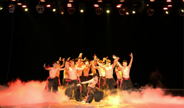 演出接近尾声,最后一个节目出乎了大家的意料,音乐学专业的20余名男学生穿上传统服饰,给观众们带来了一场热血沸腾的鼓子秧歌《脊梁》。动感的节拍、大声的嘶吼、豪迈的舞姿,非专业学生的表演的比起专业舞蹈演员也毫不逊色。参演者杨伟杰说:“排了了一年多,每次都是大汗淋漓,每次都热血沸腾。舞蹈动作对于非专业的我们来讲确实困难,每次排练膝盖都会红肿。但我们克服很多困难,最终的效果总算让努力没有白费。”