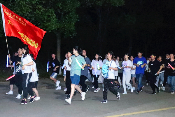 动感的音乐、炫酷的舞姿、乐器表演……活动伊始,协会为参与者们带来了开场表演,学生们跟随节奏挥舞着荧光棒,场下呈现出一片“星海”景象。随着活动的正式开始,在校园里,能够看到一条由700余人汇聚而成的“荧光长龙”,他们手上拿着荧光棒,戴着荧光手环、荧光眼镜,节奏有序地朝着目标前进。