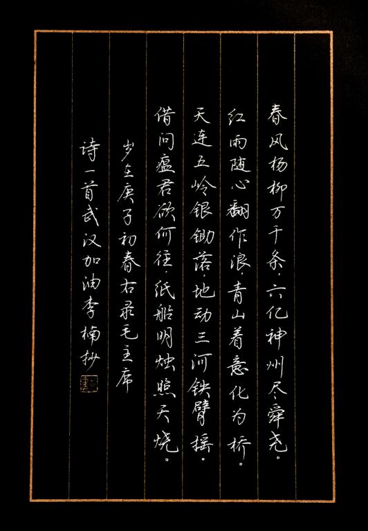 17幅作品中有一幅比较特别,上面除了创作者写的一首诗,还画了一个小女孩握着彩色气球,放飞黑白色气球的画面。应用统计学2018(1)班的胡红倩是这幅作品的创作者,在被问到创作作品意义时,她说:“颜色暗淡的气球代表了这次的病毒,而彩色的气球则代表了生机勃勃的九州,下方的小女孩大部分以粉色为主,代表了天真和善良。女孩放开暗淡气球,紧握着彩色气球,与诗中的‘抑病毒’和‘还九州一抹五彩’相对应。整个作品的寓意是希望这次病毒赶快离开,还九州最初的模样。”