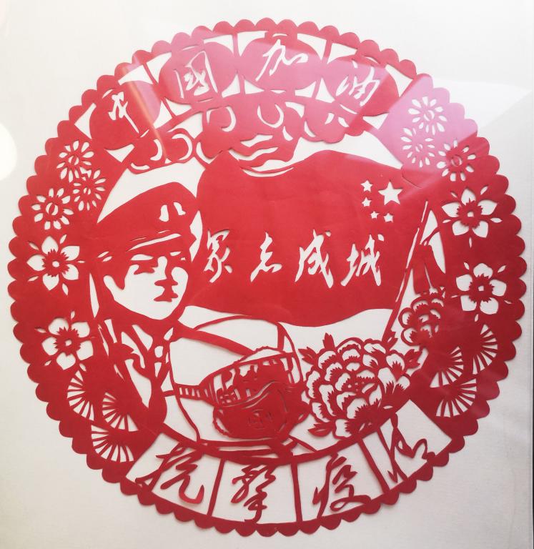 刘可是学校庆少仪剪纸工作坊的一名学员。她创作的剪纸以身穿防护服的医生和警察等一线抗疫人员为主体,鲜花环绕,配着“中国加油”“众志成城”“抗击疫情”的字样。“最近我的心情是很沉重的,因为确诊人数每天都在增多,但是在制作剪纸的这几天了解到治愈人数也在不断地上升,我感觉到了中国的强大,看到了这场没有硝烟的战争的胜利曙光。”