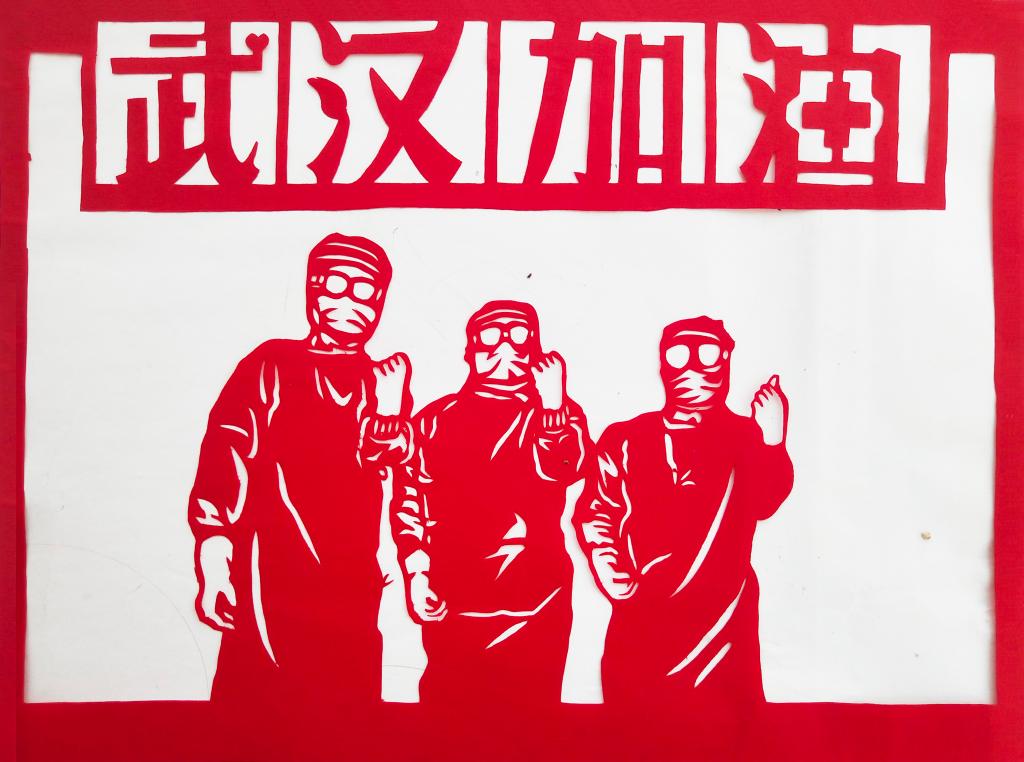 工作坊另一位学员林青青创作的剪纸作品以三名穿着防护服的医护人员为主体,配上“武汉加油”的字样,表达为武汉加油,为医护人员加油的心情。