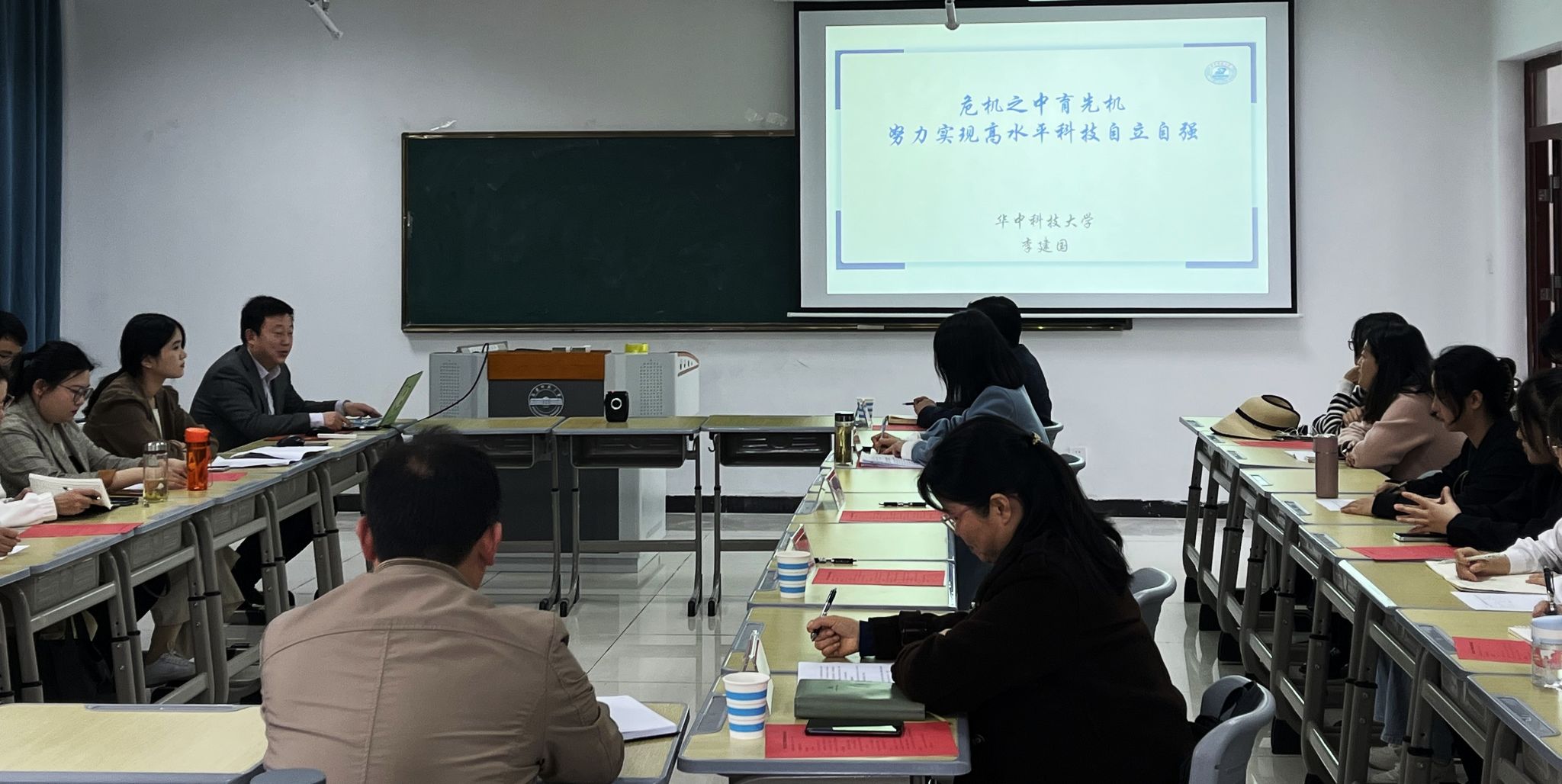 4月1日,全国首届高校思想政治理论课教学展示特等奖获得者、湖北省高等学校中青年马克思主义理论家培育计划人才,湖北省优秀青年社科人才,教育部思想政治工作创新发展中心专家委员会委员,中共湖北省委讲师团专家成员、华中科技大学马克思主义学院副院长、博士生导师李建国教授应邀作客“3.18大讲堂”,作题为“危急之中育先机:努力实现高水平科技自立自强”的报告。报告在马克思主义学院楼212教室举行,学院党政领导班子成员、全体青年教师及部分硕士研究生、本科生参加。报告会由院长严仍昱主持。