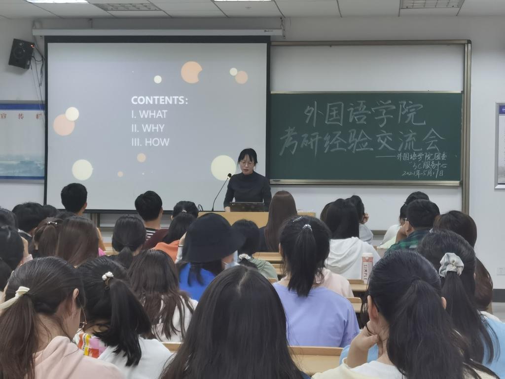 为帮助同学们更加充分地了解考研情况,解决同学们在考研过程中遇到的问题,5月17日,外国语学院开展考研经验交流会。本次交流会由外国语学院团委学生会“3c”服务中心承办,2017级考研成绩优异的11位毕业生受邀前来分享考研经验和心得,2018至2020级学生参会。