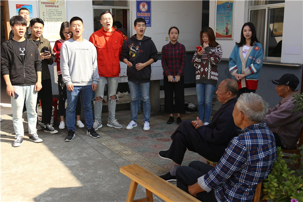 在聊天过程中,一位老爷爷提到他年轻时会唱红歌,志愿者王呈罡立马拿出随身准备的竹笛,配合学美声的学生李小虎为老人们演唱了一段《没有共产党就没有新中国》,一曲奏罢,老人家赞不绝口。在负责人杨伟杰的提议下,所有人在院子里站成一排,合唱了一曲《我和我的祖国》,歌声回荡在小院里,与老人们连续不断的掌声相互辉映,小院里迎来了难得的欢乐时光。87岁的老人邵锦绣擦了擦眼角感叹道:“这歌唱的好啊!国家现在好了,都是共产党的功劳啊,这些孩子们也是党员,前途无量啊!”