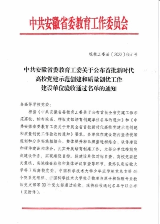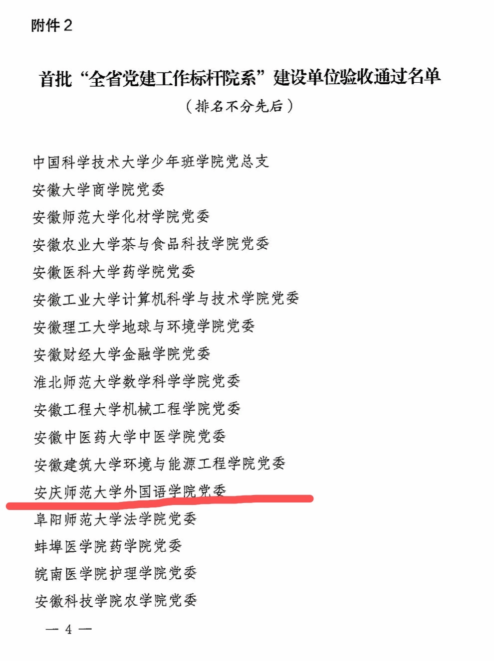 日前,中共安徽省委教育工委陆续公布第二批新时代高校党建示范创建和质量创优工作验收结果、安徽省首批新时代高校党建示范创建和质量创优工作建设单位验收通过名单。外国语学院党委顺利通过全省首批党建工作标杆院系培育创建单位验收。