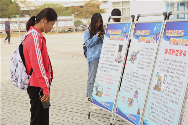 材料化学专业2019(1)班的张静领完宣传手册后边和同学一起观看两旁的宣传海报,边分享自己知道的误入传销组织的案例。“我看过新闻中关于传销组织对人摧残迫害的恐怖事件。进入大学后接触到更多事物,我越发提醒自己要加强安全防范意识,并和身边的朋友相互监督,谨防受到传销诈骗行为的坑害。”