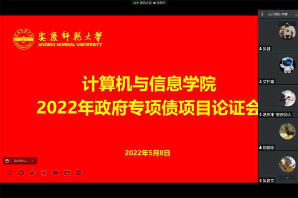 5月8日,计算机与信息学院组织召开“智能感知与计算”安徽省高校重点实验室2022年政府专项债建设项目论证会。本次论证会采取线上形式。会议邀请安庆职业技术学院信息技术学院院长疏国会教授,37000cm威尼斯电子工程与智能制造学院黄忠博士、胡浪涛博士等3位专家参加项目论证。“智能感知与计算”安徽省高校重点实验室常务副主任吴健、吴海峰教授出席会议,重点实验室部分骨干教师参加论证会。论证会由吴健主持。
