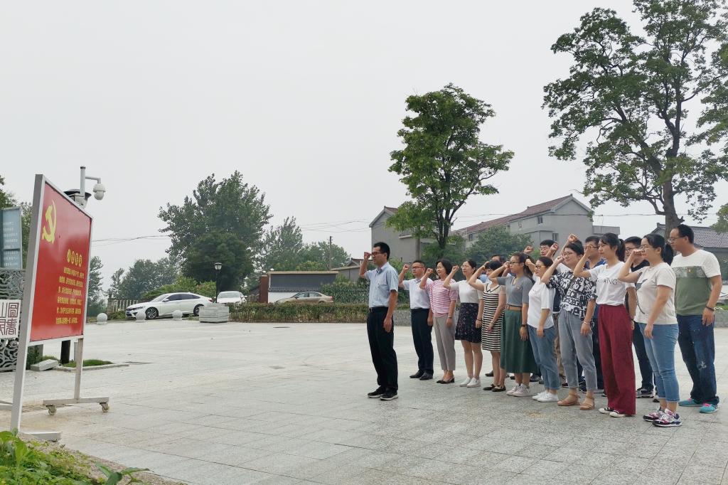 在邓稼先故居广场,全体党员面对鲜红的党旗,郑重举起右手,在夏建华的带领下重温入党誓词,使党员同志们受到一次心灵的洗礼,表达了向革命先辈学习,为党的事业奋斗终生的承诺。