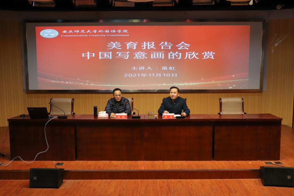 11月10日,外国语学院在E503教室举行以“中国写意画的欣赏”为主题的美育报告会,安徽省美术家协会会员、安庆市美术家协会副主席、安庆市政协书画院画家童虹应邀作报告,报告会由学院党委副书记夏斐主持,学院入党积极分子、青马班学员与艺术俱乐部成员共130余名学生参加了报告会。