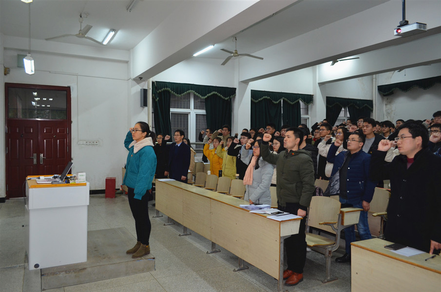 12月18日下午,物理与电气工程学院党委在稼先楼一楼多媒体教室举行新党员入党宣誓暨老党员重温入党誓词仪式。学院党委书记江贵生主持仪式并讲话,学院全体党员参加了仪式。