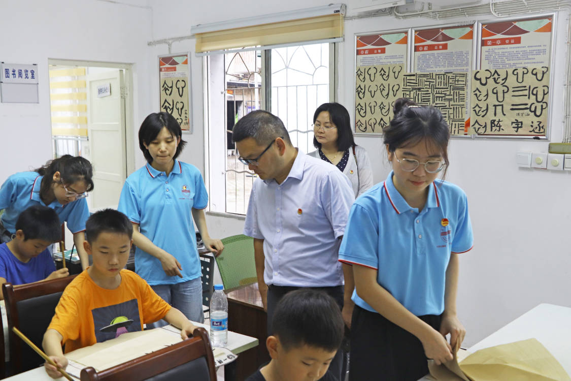 在吴樾社区党群活动中心,陈东一行旁听了实践团成员的书法教学课,询问实践团课程安排,观看小朋友们做的手工作品,了解团队的工作和生活情况。