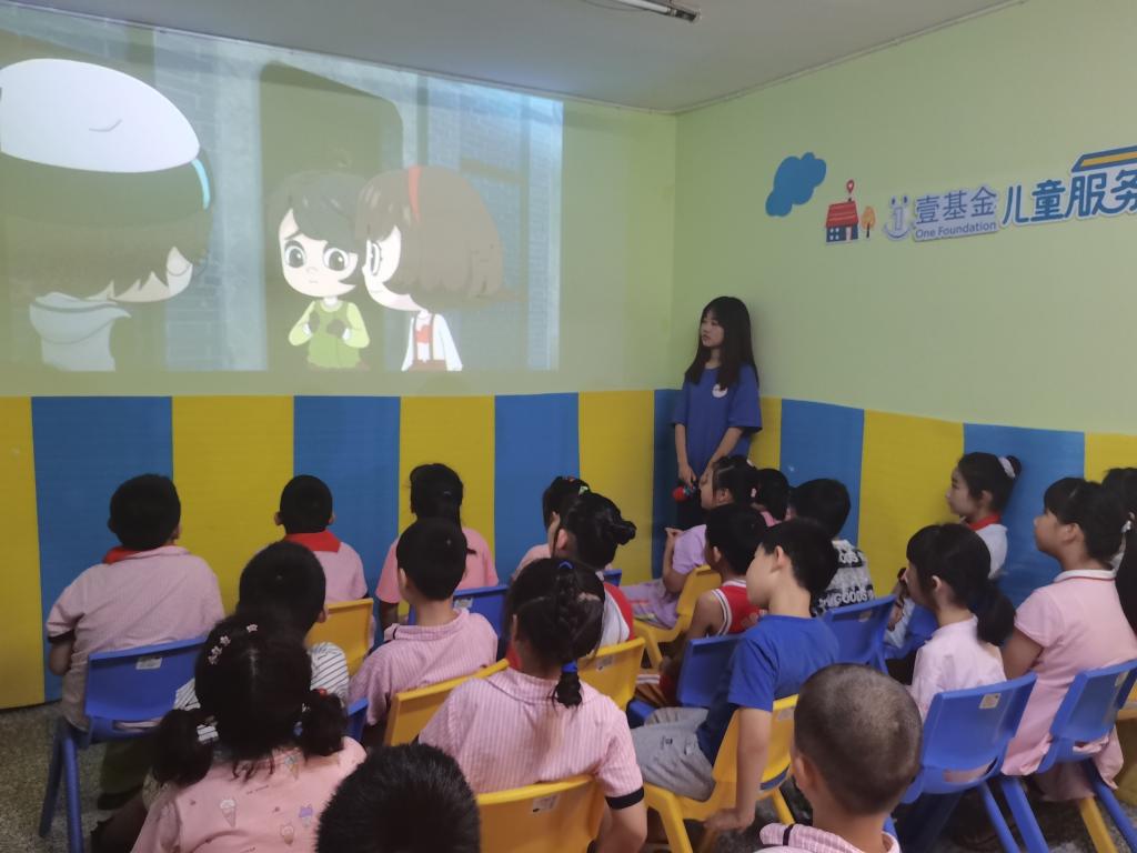 “敌人看见王二小在山坡上放牛,就叫他带路。王二小装着听话的样子走在前面,为了保护转移的乡亲,把敌人带进了八路军的埋伏圈……”考虑到孩子们年纪尚小,直接宣讲难以激发他们的兴趣,实践团一致决定将朗读红色故事和播放动画短片的形式相结合,通过讲述典型榜样的动人事迹推动小朋友们深入学习百年党史,感悟革命力量。