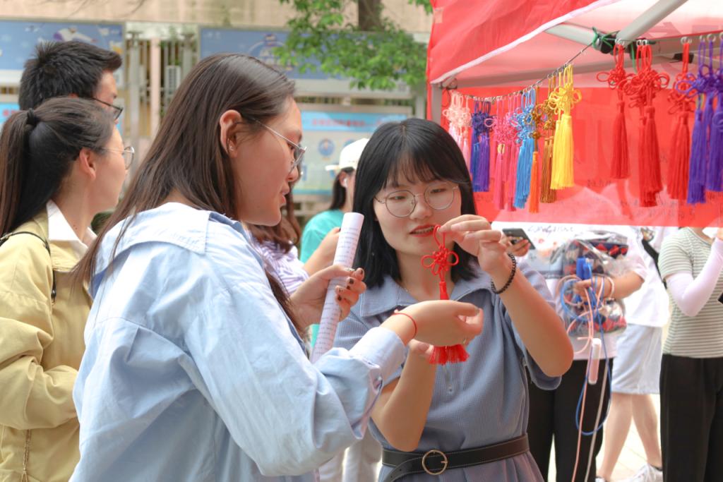 此次活动分为两种参与形式,学生们可以在横幅上写下对毕业生的祝福,也可以亲手体验中国结的制作,参与活动即可获得俱乐部的精美中国结作品。“早在半个月前,我们就投入到了此次活动的准备工作之中。”俱乐部负责人、地理科学专业2020级(3)班的学生马文静表示,古来便有“中国结寄相思”的说法,毕业季临近,俱乐部希望通过此次活动为毕业生们送去一份来自学弟、学妹的祝福。