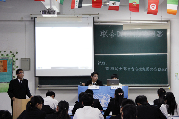 会上,由数十位同学扮演的不同国家的外交官围绕“减排的全球合作与碳交易的全球推广”这一议题进行辩论。与会代表以联合国会议的形式,通过阐述观点、政策辩论、投票表决、做出决议等步骤,逐步深入阐述自己所代表的国家的观点。