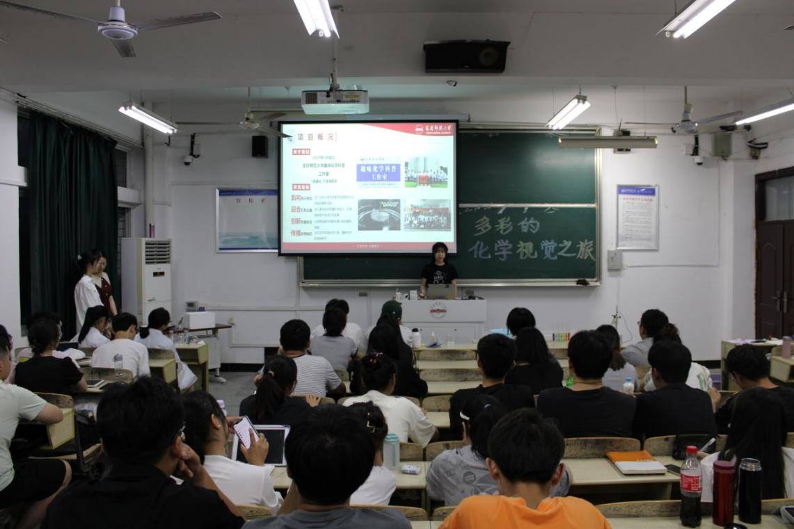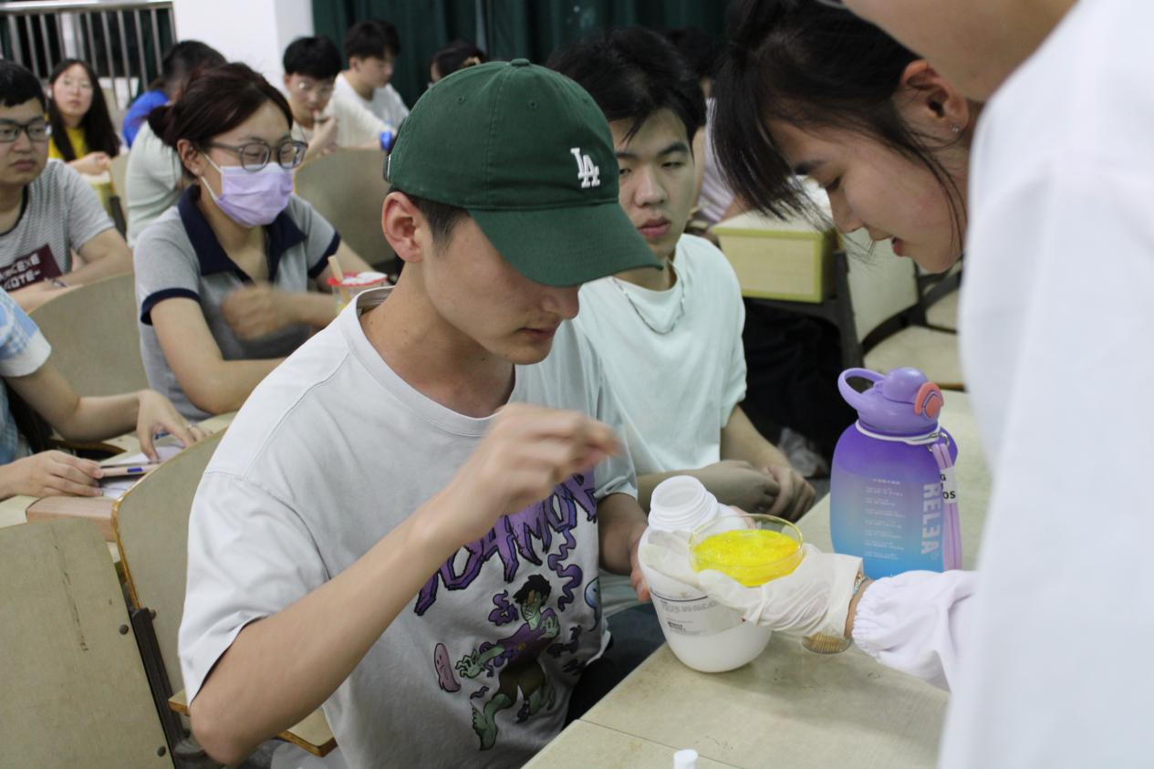 “美丽的彩虹溶液”“神奇的大象牙膏”“会变脸的晴雨花”“变幻莫测的海洋之心”“惊心刺激的掌中火焰”等实验,给现场同学带来了一次难忘的视觉色彩冲击。主讲人与观众积极互动,营造了热烈浓厚的课堂氛围。项目团队积极发挥专业优势,轻松有趣地讲解实验原理和过程,不仅让同学们观看到趣味化学实验现象,还让同学们明白了奇妙化学现象蕴含的原理。“抓住一闪而过的灵感,通过实验最终实现,这让我觉得很自豪”,2021级化学(4)班的学生高婉晴说。