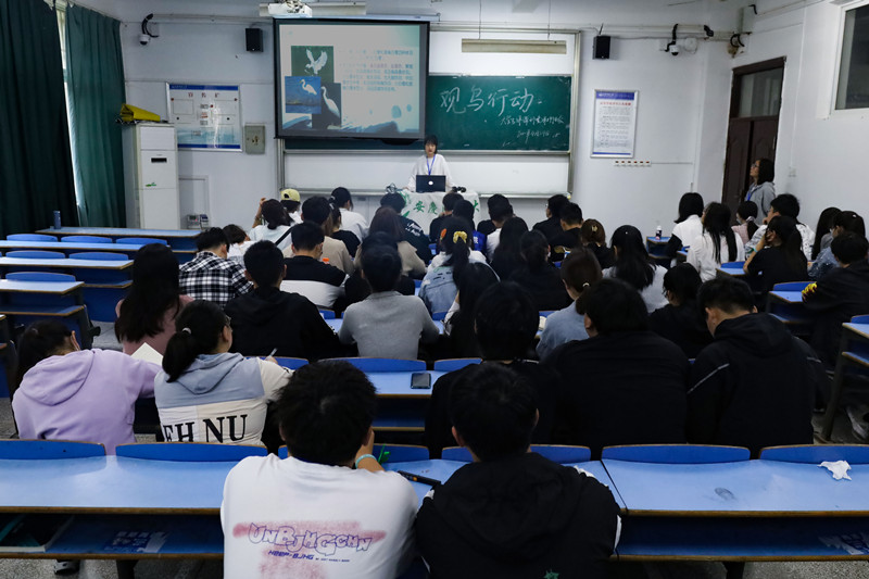 “斑鸠和灰喜鹊是我们学校最常见的鸟类,你们观察时动作一定要轻缓……”观鸟开始前,活动负责人、新闻学专业2020(2)班的陈宝莲在文溯楼104教室首先为大家讲解了望远镜的使用方法和观鸟时的注意事项。接着介绍了校园内存在的鸟类种类、外貌特征、生活习性以及常出现的地点,为后面的观鸟认鸟做准备。