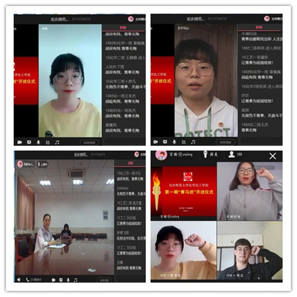为引导广大团员青年树立正确的价值观,不断提高学生骨干、团干的政治素养,培养造就一批用马克思主义中国化最新成果武装头脑的、信仰坚定的青年马克思主义者。5月9日下午,化学化工学院团委举行“青年马克思主义者培养工程”第一期培训班开班仪式暨“绽放战疫青春˙坚定制度自信”主题实践系列活动之“我与战‘疫’英雄面对面”先进事迹报告会。学院党委副书记鲍青燕和主要团干、全体专兼职辅导员出席活动。活动邀请了中国人民解放军海军安庆医院援鄂医疗队全体成员在线直播作报告。观看本次直播活动的还有学院教师、学生代表及第一期“青马班”学员共计两百余人。