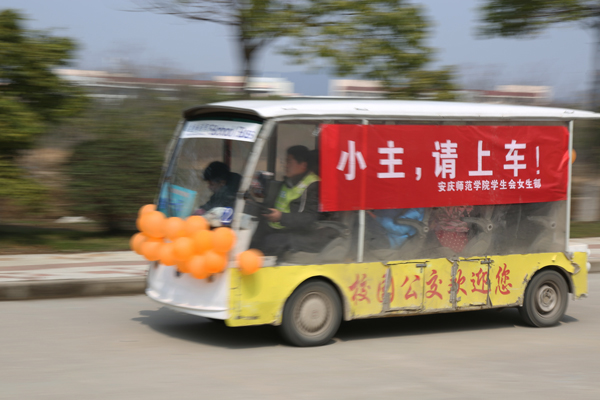 “小主们,请上车”“师院女生,节日快乐”, 3月7日,八辆挂着条幅的“公主校车”穿行在校园里,只要女生穿的衣服与校车上绑的气球颜色一样,就可以全天免费乘坐校车。“我们惊呆了,没想到校车也会‘卖萌’。”外汉专业12级的王玉莉笑着说。早在女生节的前一天晚上,安庆师范学院学生会女生部的成员们就把所有的校园公交都装饰了一遍,挂上五彩缤纷的气球,拉上鲜艳的条幅,瞬间就把它们改造成梦幻的“公主校车”。“公主校车”载着穿着五颜六色的姑娘们行驶在校园里,为持续两周被阴雨天气笼罩的安师院增添了一抹暖色。