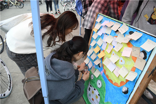 “不要再熬夜了,早睡早起。”“不要挂科!”“希望父母身体健康。”“教资一定要过!”……活动开始不到十分钟,小小的心愿墙已被贴满一半。